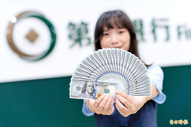 A bank clerk holds up US$100 banknotes at a branch of the First Commercial Bank in Taipei in an undated photograph.