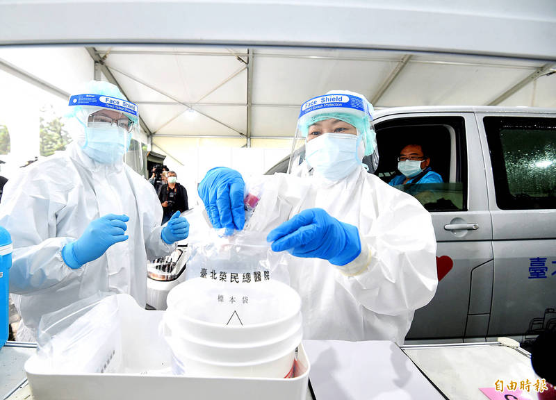 Health workers simulate processing a sample at a drive-in COVID-19 rapid test center outside the Chiang Kai-shek Memorial Hall in Taipei yesterday during a trial run. The center opens to the public today for drive-in rapid testing.