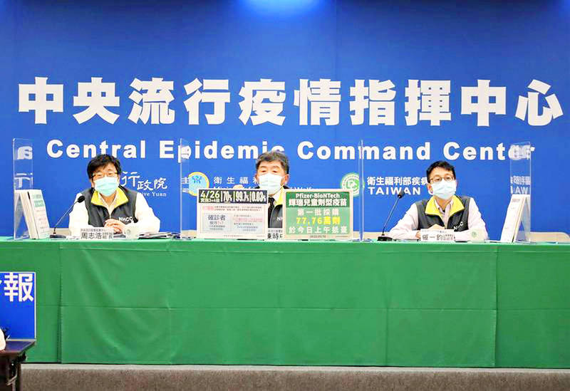 Minister of Health and Welfare Chen Shih-chung, center, holds information boards at the Central Epidemic Command Center’s daily COVID-19 news briefing in Taipei yesterday.