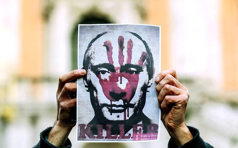 A protester holds up a picture of Russian President Vladimir Putin at a rally against the invasion of Ukraine in Rome on Friday.