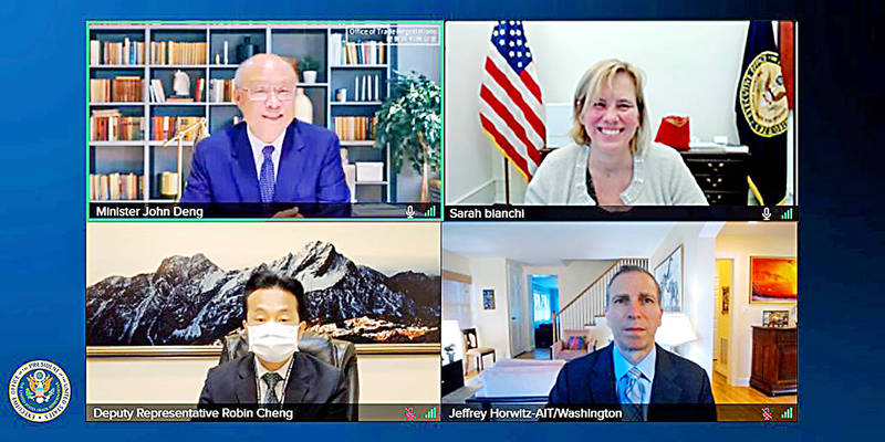 The first round of negotiations is to be held later this month in Washington, Minister Without Portfolio John Deng (鄧振中) told reporters on Wednesday following a virtual meeting with Deputy US Trade Representative Sarah Bianchi.