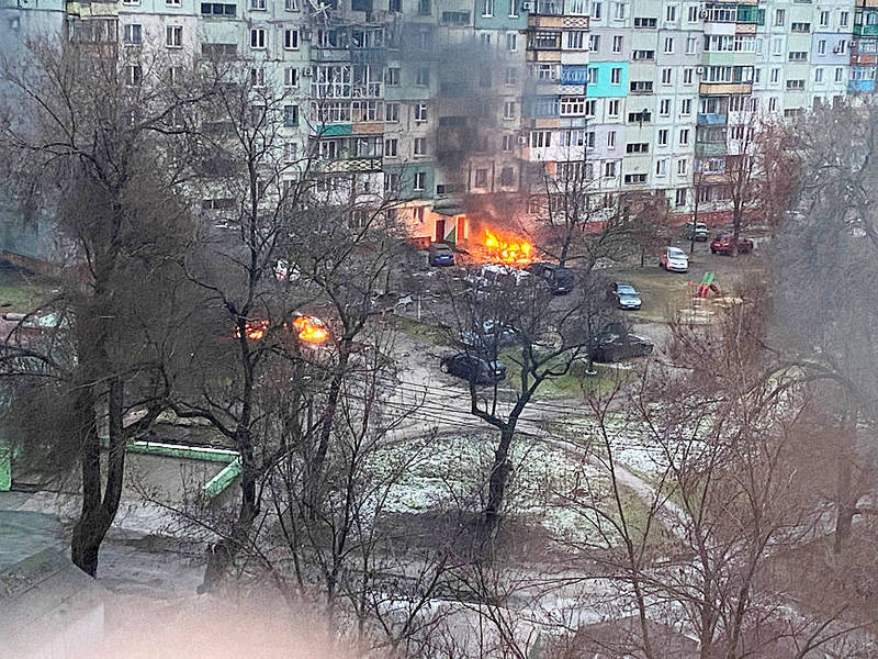 Fires burn after a residential area of Mariupol, Ukraine, was shelled on Thursday.