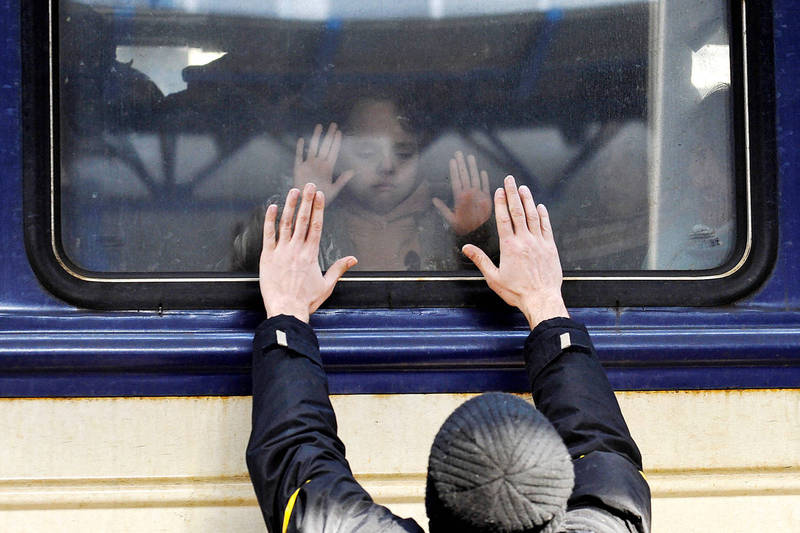 A man gestures to a child in front of an evacuation train at Kyiv’s central train station on Friday.
