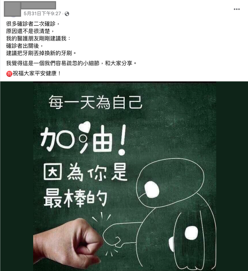 網路自5月開始流傳訊息,稱「很多確診者二次確診,原因還不是很清楚,朋友的醫護朋友建議:確診者出關後,建議把牙刷丟掉換新的牙刷」、「很多確診者二次確診,原因還不是很清楚,醫護朋友剛剛建議:確診者出關後,把牙刷丟掉,換新的牙刷。把舊毛巾丟掉,換新毛巾」,查核中心對此查證。