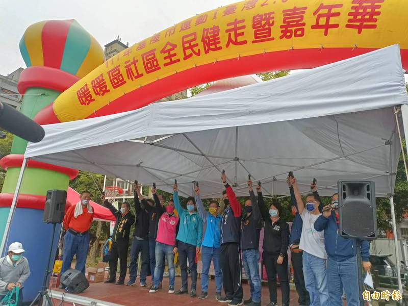 2022年「基隆市運動i台灣2.0」社區全民健走暨嘉年華,今天一早在暖暖區碇安運動公園開走;圖為鳴槍儀式,不少有意投入年底選舉的候選人均到場共襄盛舉。(記者俞肇福攝)