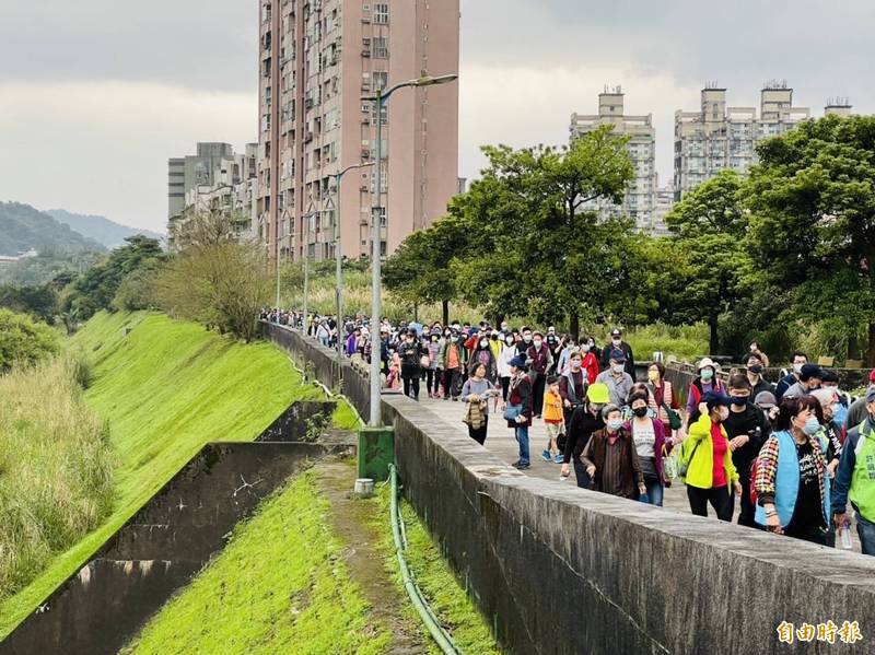 2022年「基隆市運動i台灣2.0」社區全民健走暨嘉年華,今天一早在暖暖區碇安運動公園開走,1500多位民眾冒著毛毛細雨大步向前,欣賞基隆河堤岸的自然景色。(記者俞肇福攝)