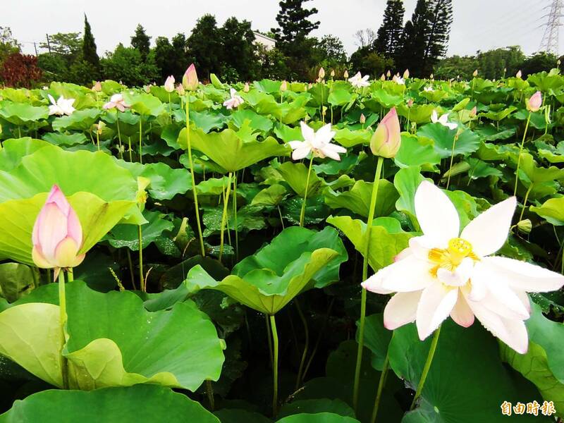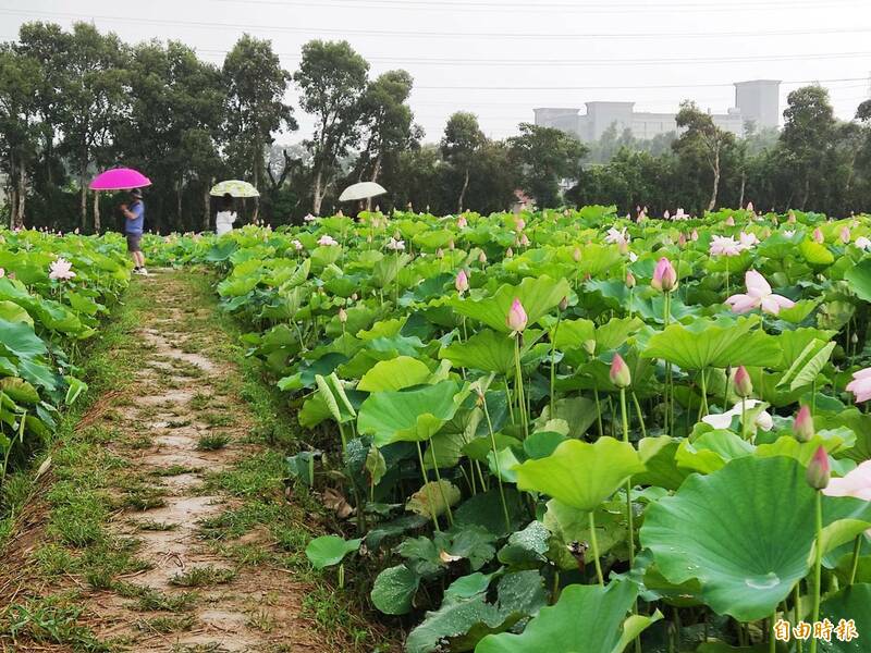 〔記者鄭淑婷/桃園報導〕為期近2個月的「桃園蓮花季」,今早在雨中開幕,遊客撐著傘漫步蓮田賞花,錯落其間的5處主題裝置藝術芳草碧蓮天、蓮田野營、荷你相浴、蓮荷映月、蓮花小學堂以及公埤旁擎雨步道,都是今年活動亮點。