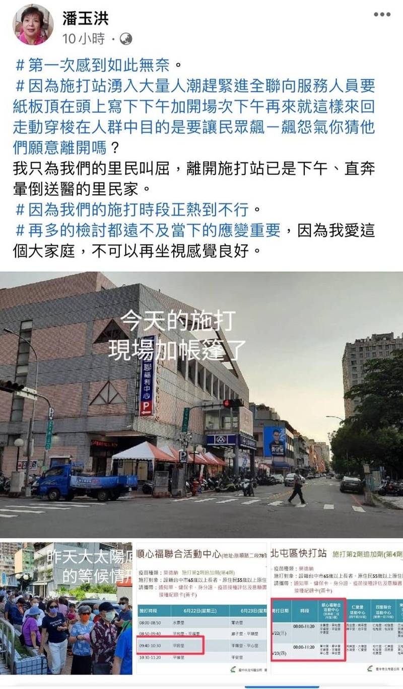 潘玉洪說,中南部疫情嚴重,早在長者開放施打第4劑就有不少長輩詢問快打站何時開打,這次面對長者排隊打疫苗等到中暑昏倒,讓她第一次感到如此無奈,也因排隊人潮太多,她也趕緊到快打站樓下的全聯超市要紙板寫上加開下午場次,頂在頭上在人潮穿梭勸說,讓長者飆罵、發洩怨氣,最後才有少數離開。