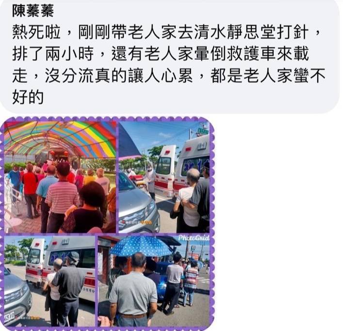 還有清水區快打站靜思堂在昨天也傳出有長輩排了2小時,暈倒被救護車送醫,網友PO出照片證實說,沒分流真的讓人心累。