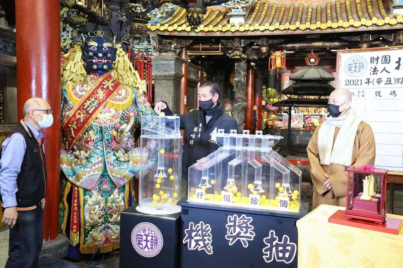 北港朝天宮董事長蔡咏锝指出,因為舉辦祈安法會,金媽祖抽獎活動改在今天下午線直播抽出,民眾有到朝天宮點光明燈、安太歲即可獲贈福袋,或是除夕夜在廟前發放有拿到,都可兌獎,去年發放約10萬個福袋。