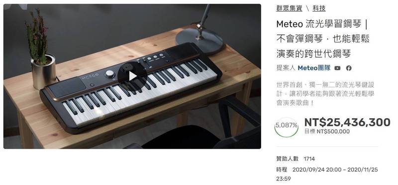 她舉例,超橘白公司在嘖嘖募資平台發起,超早鳥優惠價每台從1萬3900元至1萬6100元、標榜「不會彈鋼琴,也能輕鬆演奏」的Meteo流光學習鋼琴,自2020年9月24日開始,募資2個月直到11月25日結束,比預定50萬元目標超出甚多,共募得2543萬6300元、達成率為5087%。