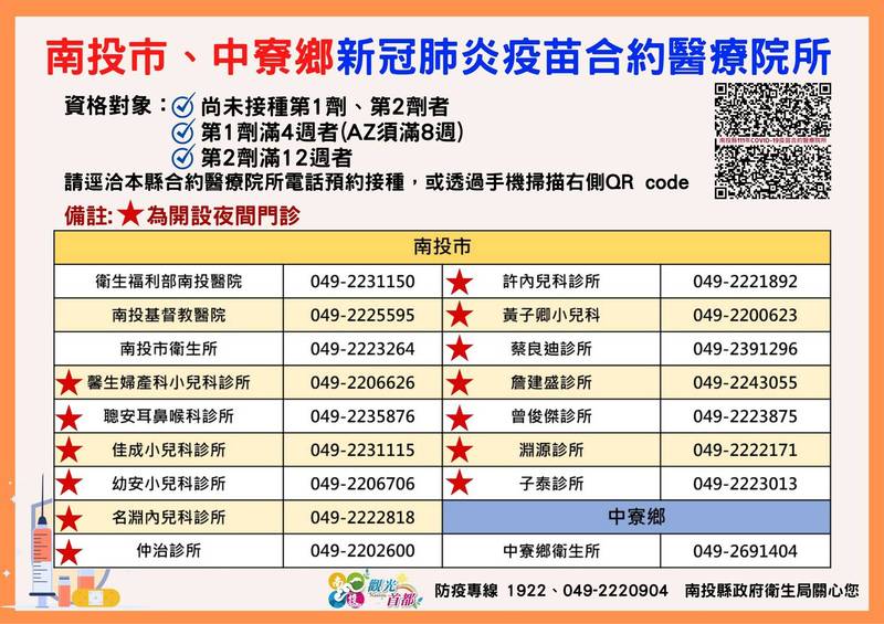南投縣目前有提供疫苗接種服務的醫療院所共有86家,但有29家只在白天提供服務,另有9鄉鎮市、57家診所,則是從白天服務到晚上,建議有需求的民眾,可先上衛生局官網查詢,並選擇住家附近診所就近接種,以免白跑一趟浪費時間。