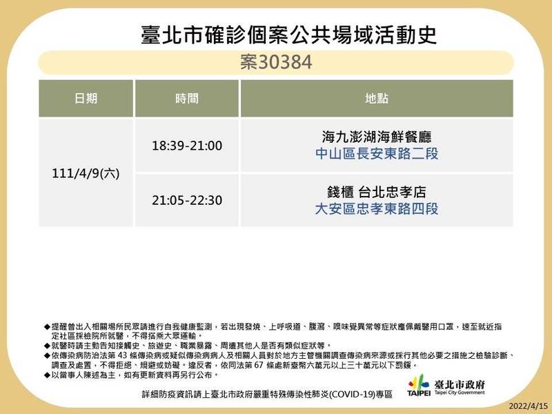 台北市衛生局公布確診者足跡。(台北市衛生局提供)