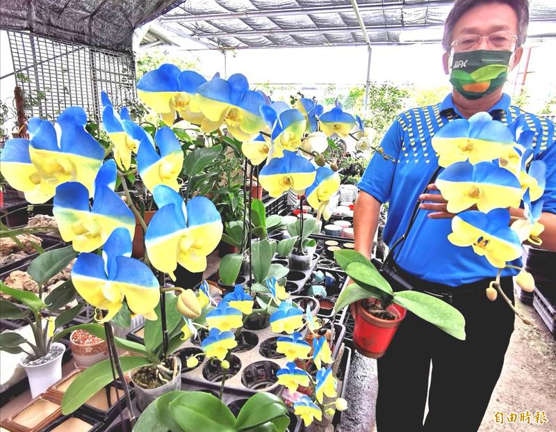 黃毅斌也以原生種的「台灣阿嬤」小花蝴蝶蘭進行噴染,一樣可營造出藍黃漸層色調的視覺效果,他強調,持續推廣的用意,在於聲援烏克蘭,訴求反戰、愛和平。