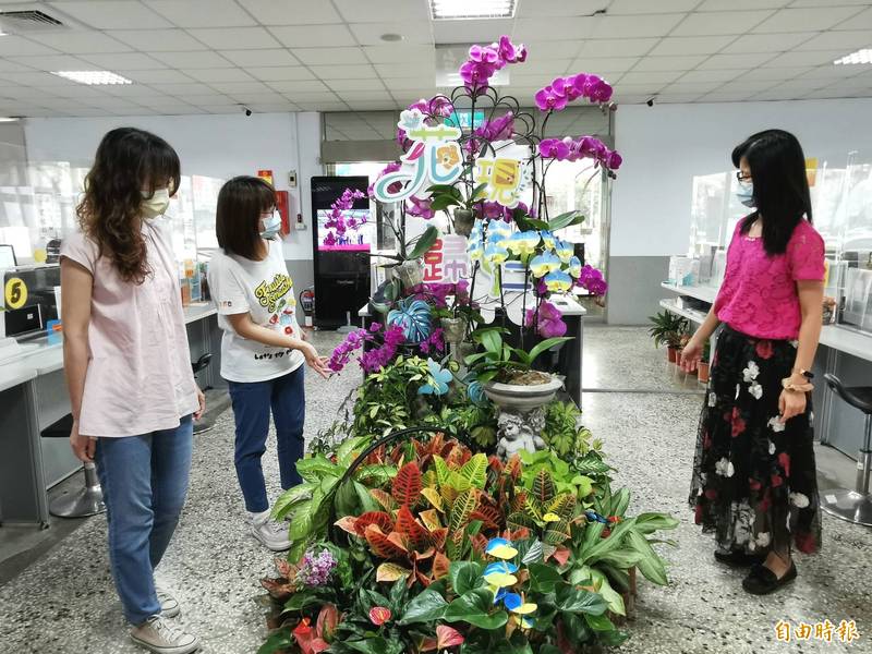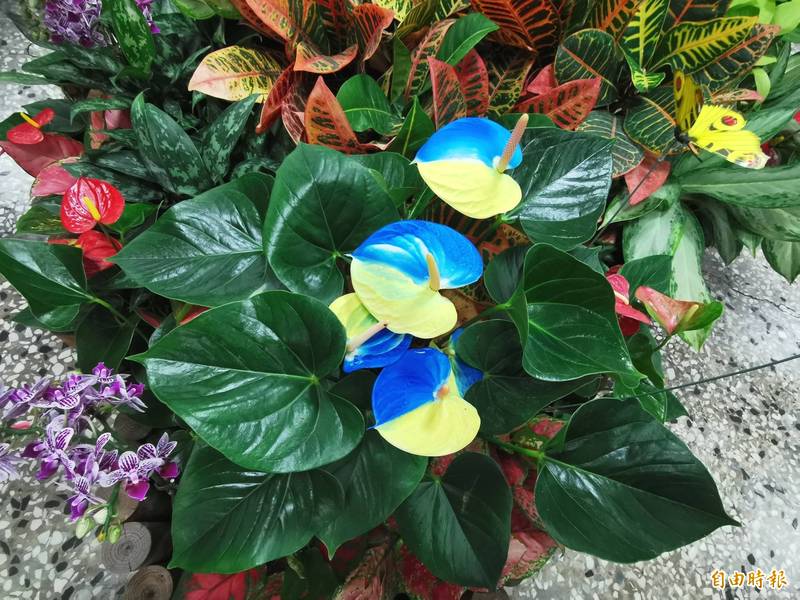 歸仁區公所迎來逾500株的各式蘭花,而當地的七甲五街花卉產銷班則加碼妝點「烏克蘭」,甚至連火鶴都有藍黃色調,引人矚目。