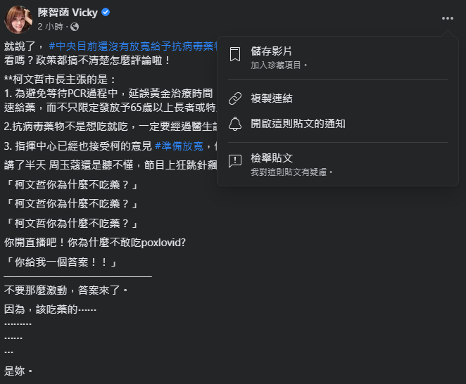 〔即時新聞/綜合報導〕台北市長柯文哲確診,媒體人周玉蔻質疑柯文哲怎麼不吃藥,在政論節目上瘋狂飆問「柯文哲你為什麼不吃藥?」引發台北市府發言人陳智菡不滿,她在臉書上打臉,中央目前還沒有放寬給予Poxlovid的給藥標準,反酸周玉蔻不要那麼激動,「因為,該吃藥的⋯⋯是妳。」