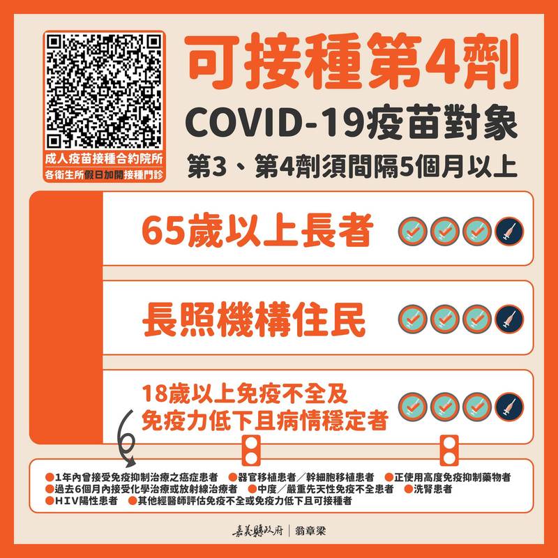 衛生局長趙紋華表示,嘉義縣確診死亡案例65歲以上、慢性病者占8成,與國內確診死亡情形相仿,中央5月16日起開放65歲以上長者、長照機構住民和18歲以上免疫不全、免疫力低下等3類族群,只要第3劑接種滿5個月,即可接種第4劑。