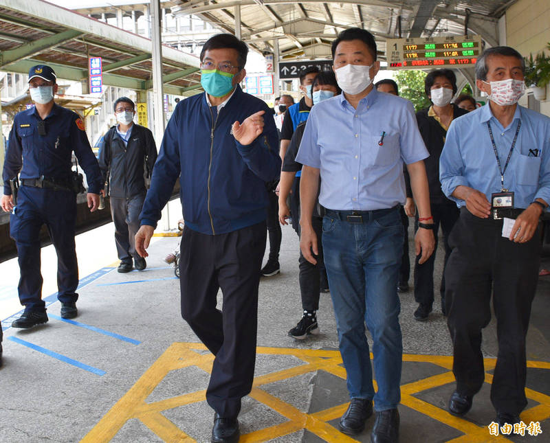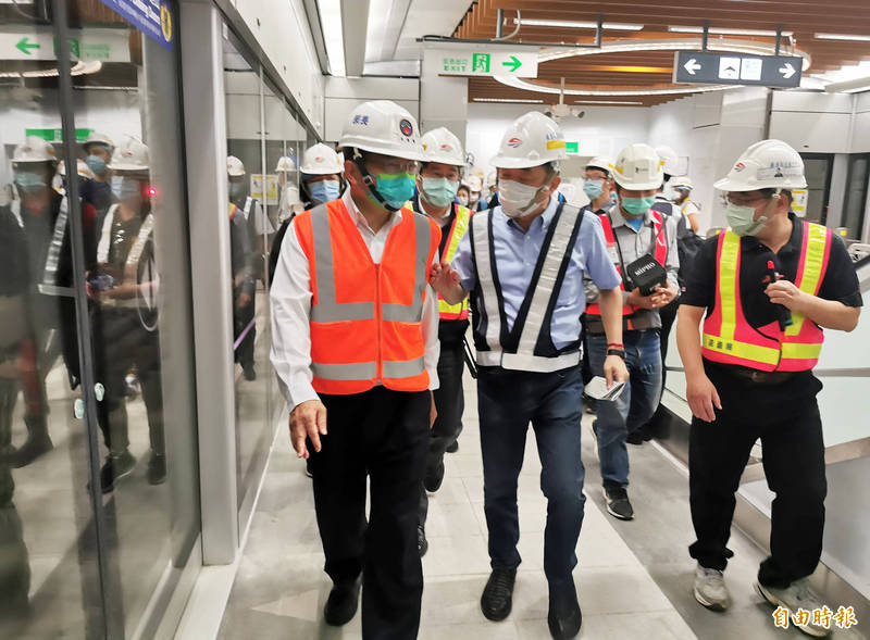 立法院交通委員會視察機捷A22老街溪站工程,立委魯明哲(前中)指出,機捷A21至A22站系統需人工轉換,且延伸至中壢車站與綠捷延伸線系統也不銜接。交通部長王國材(前左)表示,未來會將系統整合。(記者李容萍攝)