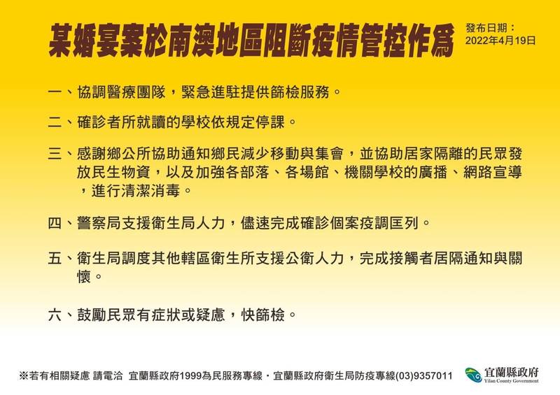 參加喜宴賓客中有不少南澳鄉親,縣府衛生局針對南澳鄉強化疫情管控,包括協調醫療團隊進駐篩檢、確診者就讀學校依規定停課、請警方支援疫調、辦理接觸者居隔通知與關懷,南澳鄉公所也協助發放居隔者民生物資,並加強鄉內各部落的環境清消。