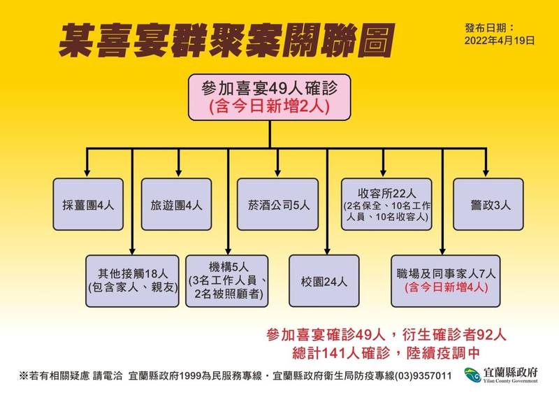 羅東晶園會館喜宴案增加6人,累計確診141人,仍是宜縣目前最大傳播鏈。 (圖由宜蘭縣衛生局提供)