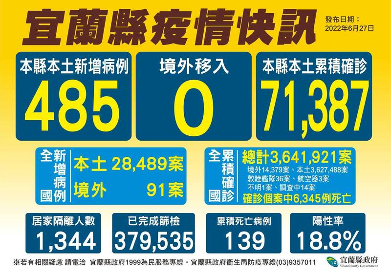 〔記者游明金/宜蘭報導〕宜蘭縣今天新增485名確診病例,無新增死亡個案,是5月3日以來,確診人數最少的一天;另,自7月1日開始,縣內部分醫院調整多功能防疫診服務時間和項目;第18波學童快打站也將於7月2日起提供服務,請有需求民眾注意相關訊息,可上衛生局網站查詢。