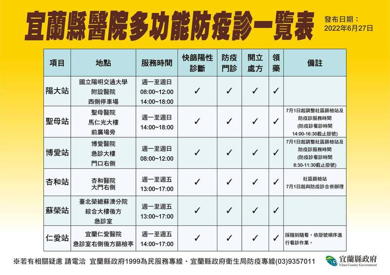 縣衛生局表示,7月1日起,羅東聖母醫院社區篩檢站調整為週一至週日下午2時至6時、防疫診看診時段調整為週一至週日下午2時至4時30分;羅東博愛醫院社區篩檢站整為週一至週日上午8時至12時、防疫診看診時段調整為週一至週日上午8時30分至11時30分。