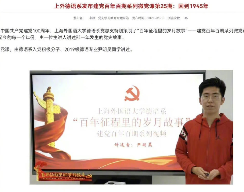網友挖出尹男「品學兼優」背景,他就讀該校德語系,是2019年山東省保送生、上海外國語大學團委骨幹培訓部組長,多次主持過團委會議,是入黨積極分子。