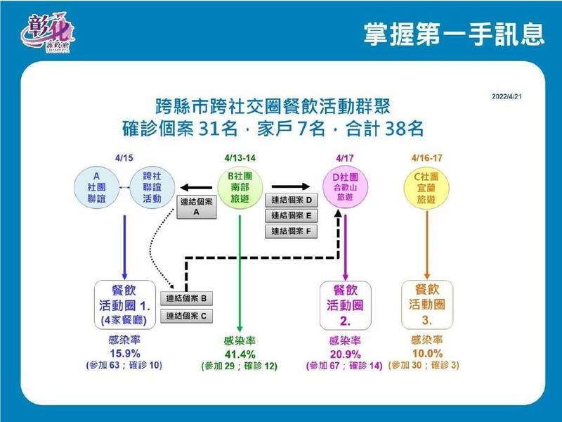衛生局長葉彥伯說,今天公布「跨縣市跨社交圈餐飲活動群聚」牽涉到5個社團,高風險第一圈匡列採檢PCR,第二圈尚未完成,已完成採檢者,有38人確診,包含個案31人、家人7人。