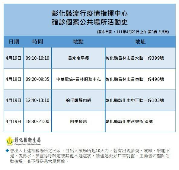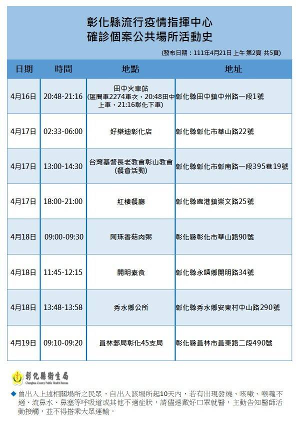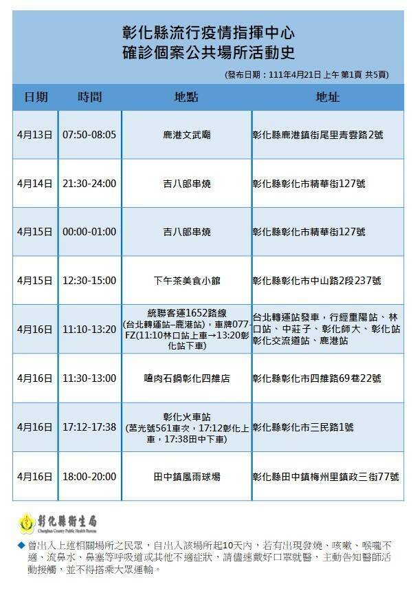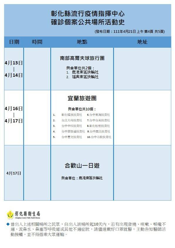 24處確診者足跡從4月13日到19日,地點寺廟、餐飲店、客運站、火車站、運動場、鄉公所遍布,其中,令人擔憂的是,4月13日到14日由鹿港東區扶輪社和福興東區扶輪社舉辦南部高爾夫球旅行團,以及4月16日到16日10個彰化和台中兩地的扶青社,還有4月17日鹿港東區扶輪社合歡山一日遊。