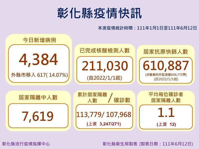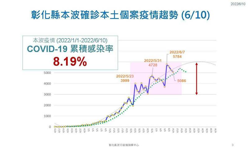 彰化縣單日確診人數超過5000人,從6月7日至昨天(11日)連續走了5天,今天趨勢反轉下降未及5000人,只有4384例,且14%、617人都是外縣市通報,顯見縣內土本確診個案數已經降了不少。