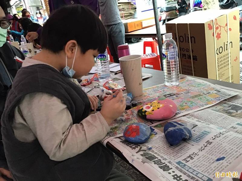 〔記者許倬勛/桃園報導〕桃園市中壢區舊地名為「石頭庄」,中平商圈發展協會今天下午結合土地公生日,提供300顆鵝卵石與畫具水彩,在中平商圈徒步區舉行「徒步藝術季彩繪石頭禮」活動,有人畫出土地公慈祥容茂,也有人手繪出家人模樣。