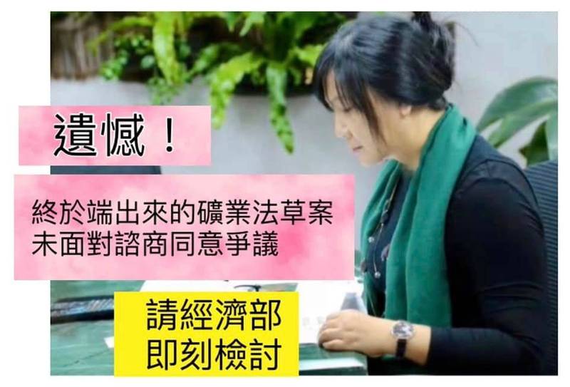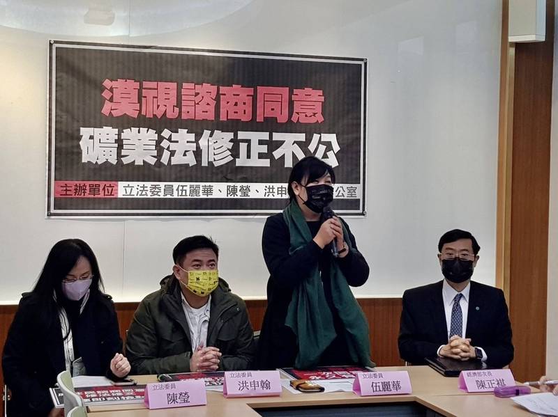 民進黨立委伍麗華、陳瑩、洪申翰今舉行記者會。伍麗華表示,經濟部預告的草案明定,既有的礦業用地若沒辦理原住民族諮商同意,須於1年內辦理,若沒辦理就要廢止礦業用地,沒獲得同意則要求停工,直到辦理原住民族諮商同意後才恢復採礦權;但這樣的修法是「做半套,留尾巴」,恐使礦權業者一再申請,經濟部等同又把責任丟回給原住民族部落、原住民族委員會和業者。