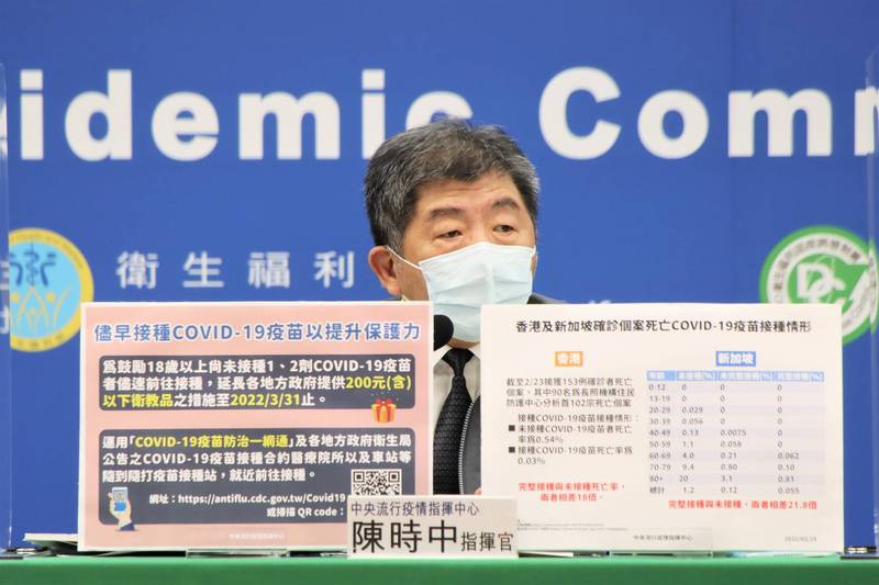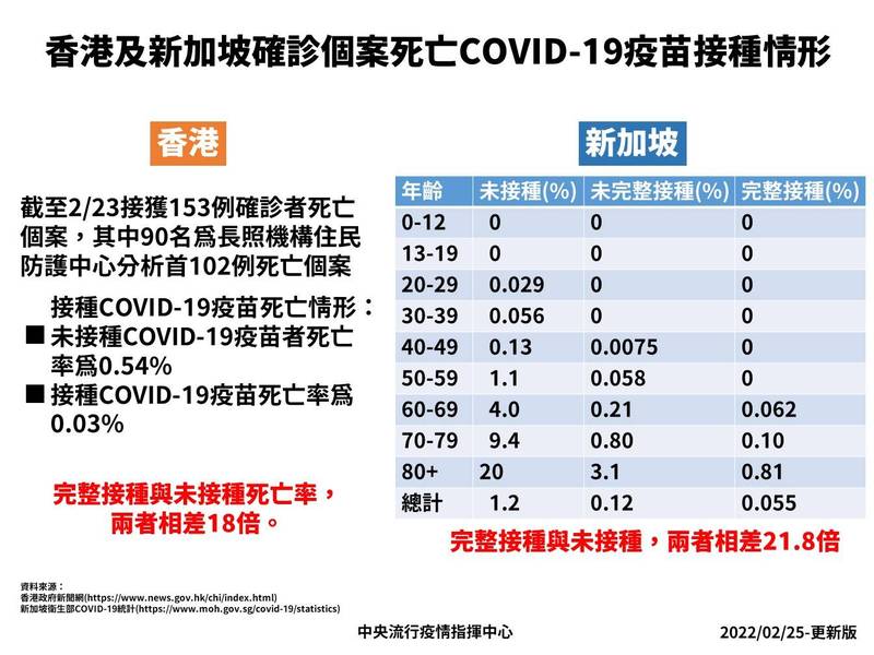 鄰近國家韓國、香港等目前疫情仍較為嚴重,指揮官陳時中在指揮中心記者會表示,香港截至23日接獲有153例確診者死亡個案,未接種疫苗死亡率為0.54%,接種疫苗死亡率僅0.03%,相差18倍,新加坡的部分則是未接種疫苗者若染疫,死亡率為完全接種疫苗者的21.8倍。