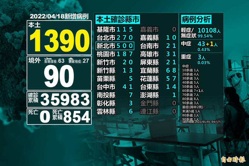 其中,854例死亡,包含840例本土,個案居住縣市為新北市413例、台北市322例、基隆市30例、桃園市28例、彰化縣15例、新竹縣13例、台中市5例、苗栗縣3例、宜蘭縣及花蓮縣各2例,新竹市、南投縣、雲林縣、台南市、高雄市、屏東縣及台東縣各1例;另14例為境外移入。