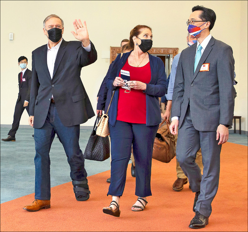 美國前國務卿龐皮歐伉儷與幕僚一行結束訪台行程,昨日下午搭乘班機飛往新加坡。龐皮歐登機前親切揮手道別,也向送機官員說「We will see you again」。 (圖文:記者朱沛雄)