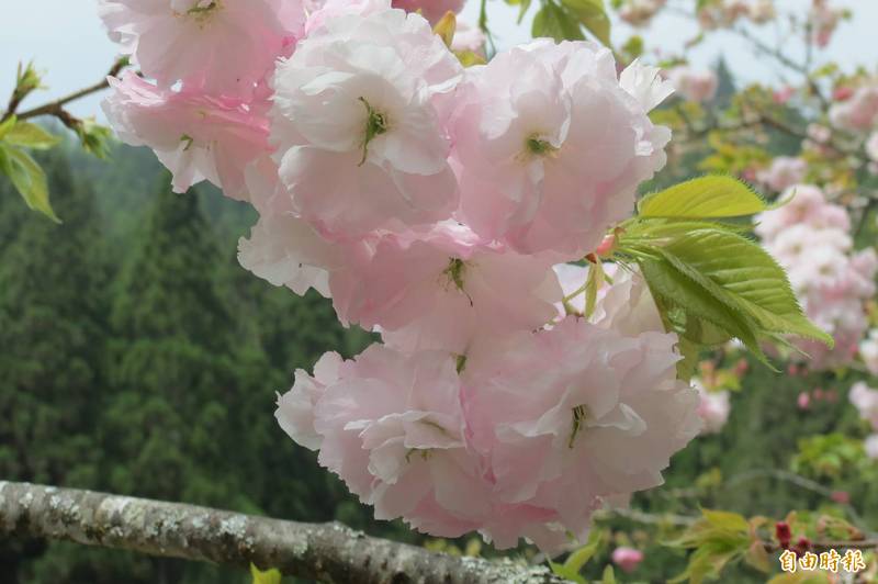 除了嬌貴的牡丹花,花期可持續到4月底,此時的園區還能欣賞到晚開櫻花鬱金櫻及普賢象櫻,其中鬱金櫻花色呈黃綠色;普賢象櫻則為淡粉紅色的重瓣櫻,較一般櫻花大上許多,特徵是花中間雌蕊彎成象牙狀突出,形似普賢菩薩騎坐白象而得名,都是台灣較少見的櫻花品種。
