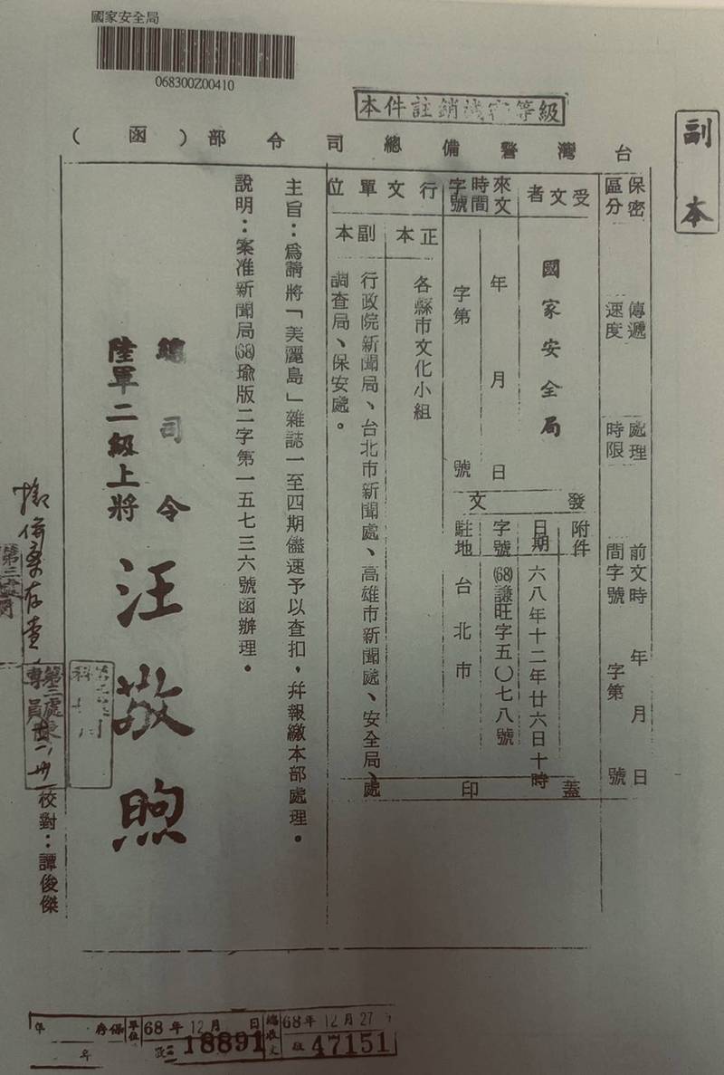 台灣警備總司令部發文國家安全局,要將美麗島雜誌一至四期盡速予以查扣,並報繳該部處理,雖然檔案已經解密,但公文上職章人名均被遮掩。(記者陳鈺馥翻攝)