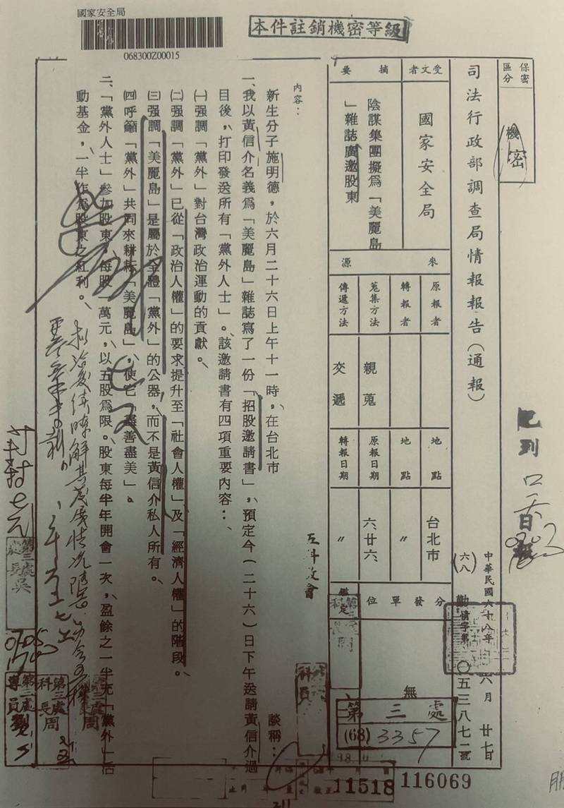司法行政部調查局在1979年發文給國家安全局,告知「陰謀集團」擬為美麗島雜誌廣邀股東。該檔案中消息來源呈報者、轉報者及情治單位職章人名均遭遮掩,呈現空白。(記者陳鈺馥翻攝)