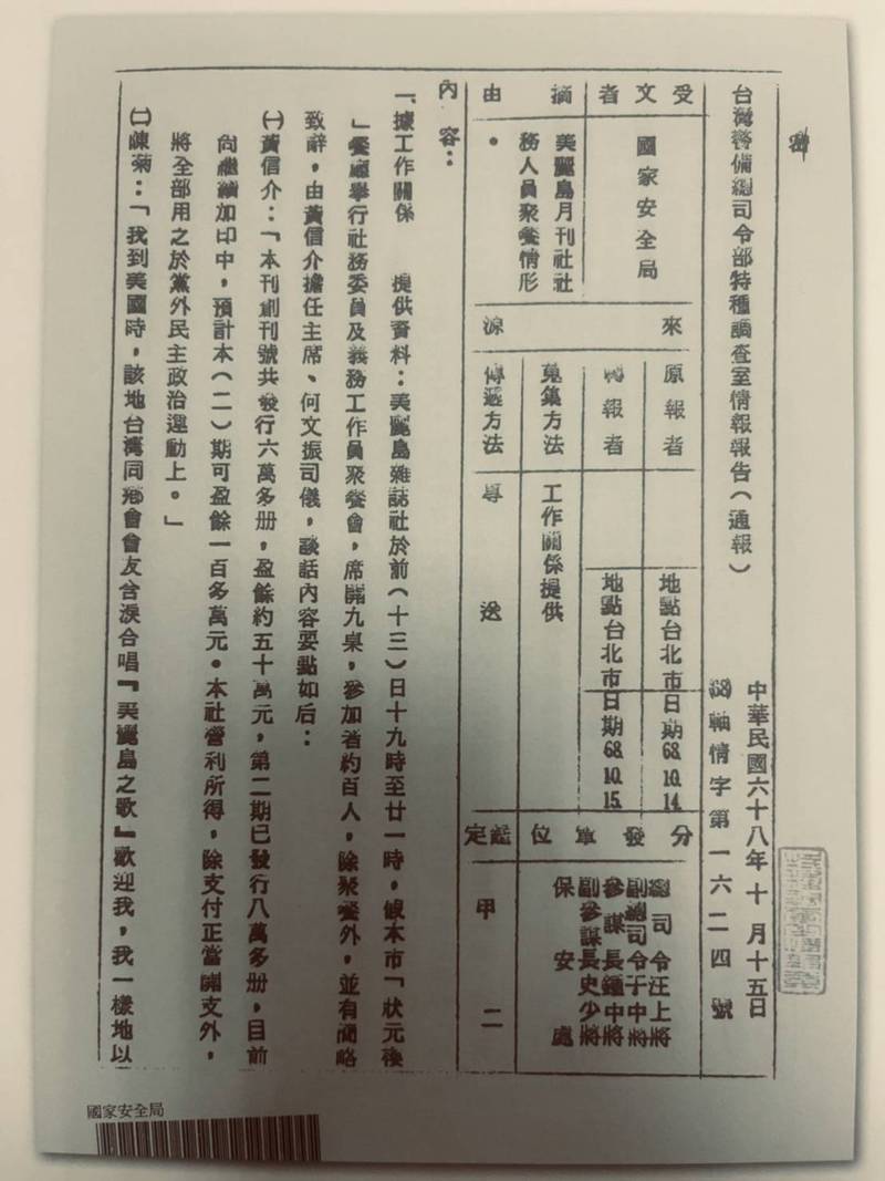 警總特種調查室呈報美麗島雜誌社社務人員聚餐情形,檔案內容包含黃信介說明創刊號發行6萬多冊,盈餘50萬元,陳菊提及她到美國時,當地台灣同鄉會友含淚合唱《美麗島之歌》等,均被監控線民記錄下來上報給國安局。該政治檔案的線民人名均被遮掩,外界調閱檔案也看不到是誰密報。(記者陳鈺馥翻攝)