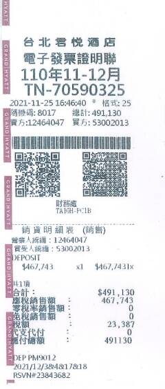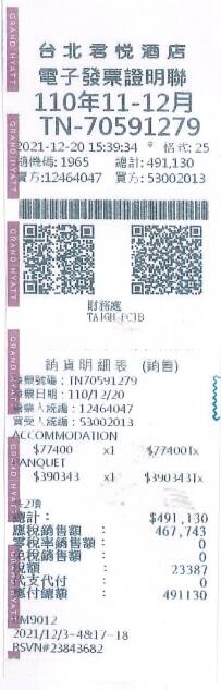 相關人士也出示,兩張由君悅飯店分別去年11月、12月的發票,開立金額均為49萬1130元,上面所登載的統編號碼為桃園機場公司。