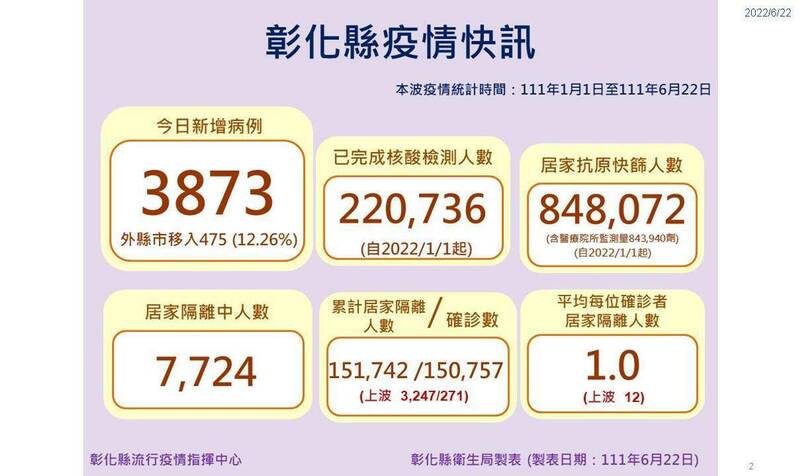 彰化縣今新增3873例,累計今年來確診人數已來到15萬757人。(縣府提供)