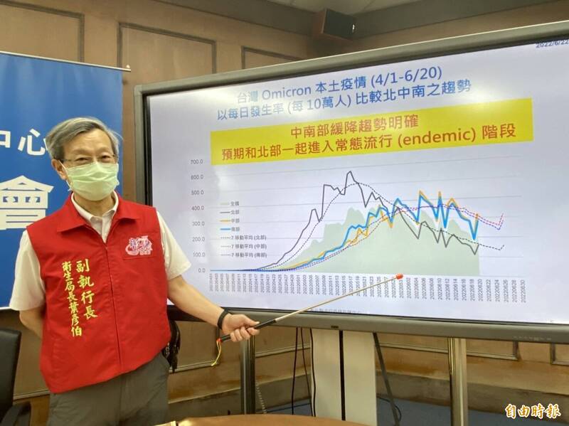 衛生局長葉彥伯表示,全台疫情發展,北部趨勢上升快下降也快,中南部疫情發展呈緩升緩降,這週起,疫情下降的曲線蠻明顯,預估這個月底疫情發展將進入常態流行階段。 (記者張聰秋攝)
