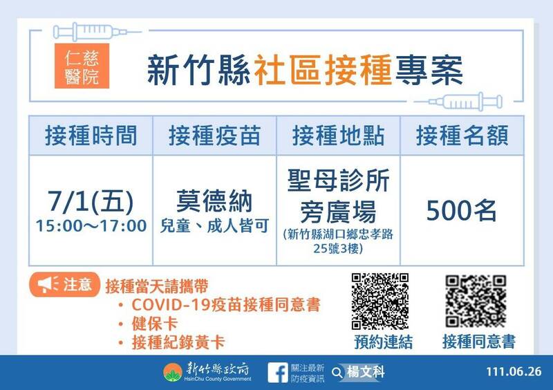 〔記者廖雪茹/新竹報導〕新竹縣政府今(26日)表示,中央疫情指揮中心公布新竹縣今新增1008例武漢肺炎(新型冠狀病毒病,COVID-19)確診病例,全縣累計確診人數90361人;湖口仁慈醫院7月1日下午3點到5點,將在聖母診所旁廣場加開社區接種站,提供各劑次莫德納疫苗共500名額,即日起接受預約,請鄉親多加利用。