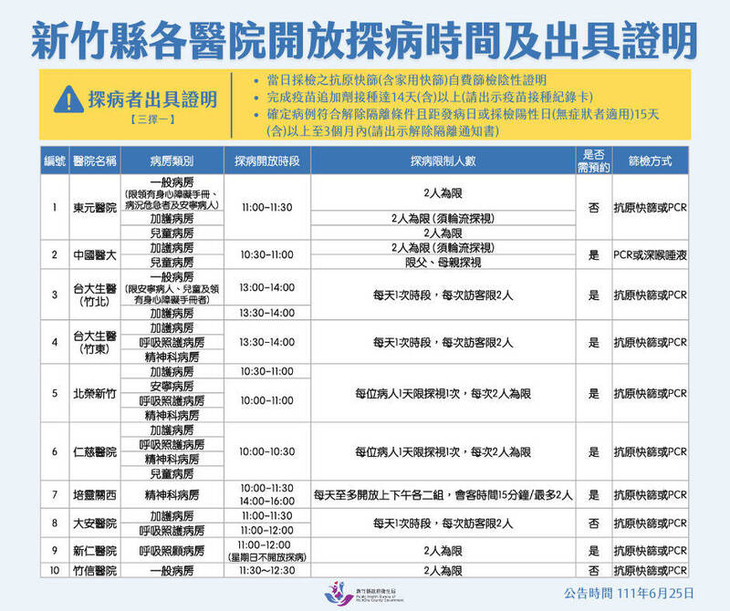 衛生局說,新竹縣配合指揮中心公布的有條件放寬醫院陪病、探病管理措施包含,醫院得開放探病,每日固定1時段,每名住院病人每次至多2名訪客為原則。第二為探病者應出具探視當日採檢的抗原快篩(含家用快篩)自費篩檢陰性證明。若為「完成疫苗追加劑接種達14天(含)以上」或「確定病例符合解除隔離條件且距發病日或採檢陽性日(無症狀者適用)15天(含)以上至3個月內」,得免除篩檢。
