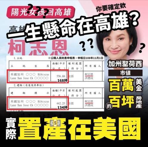 〔記者施曉光、王榮祥/綜合報導〕針對外傳在美國加州聖荷西市擁有百坪房地產,國民黨高雄市長參選人柯志恩今日在臉書主動說明表示,自己光明正大,用的都是自己的名字,也都有依法申報,並諷稱「側翼動作好快!」