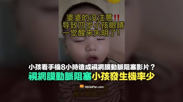 《MyGoPen》 查核平台表示,近日社群平台流傳一段影片,內容宣稱一名男童因經常玩手機,時間都長達八小時以上,造成男童「視網膜動脈阻塞」,一覺醒來竟失明了,且被發現時眼白的部分比眼珠多了許多。