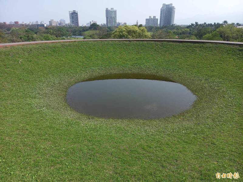 羅東運動公園望天丘積水,搭配周邊綠色草皮,被形容成為迷你版的嘉明湖。(記者江志雄攝)