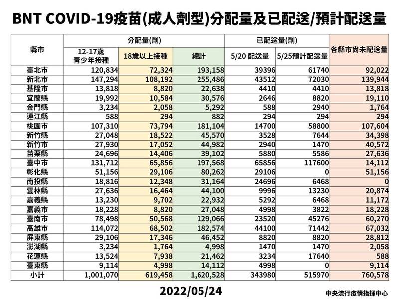 指揮中心指揮官陳時中表示,包含12至17歲及18歲以上接種需求,5月20日已配送34萬3980劑輝瑞/BNT疫苗到各縣市,明天也會再配送51萬5970劑,就剩餘76萬0578劑尚未配送。