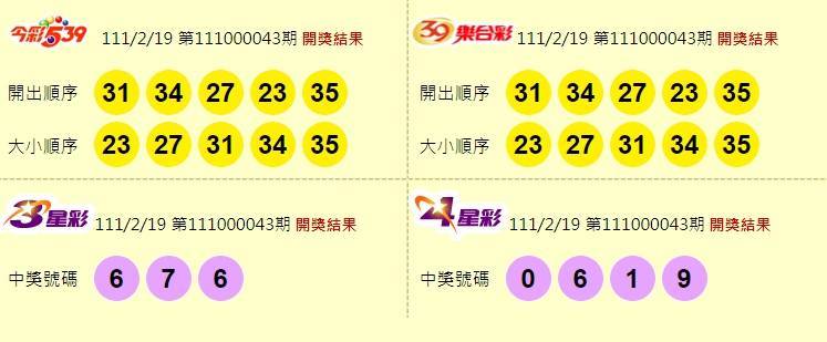 第111000043期39樂合彩中獎號碼為「23、27、31、34、35」,四合共3注中獎,每注可得21萬2500元;三合共256注中獎,每注可得1萬1250元;二合共1萬728注中獎,每注可得1125元。