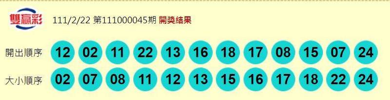 第111000045期雙贏彩中獎號碼為「02、07、08、11、12、13、15、16、17、18、22、24」,頭獎摃龜;貳獎6注中獎,每注可得10萬元;參獎共119注中獎,每注可得500元;肆獎共1326注中獎,每注可得100元。